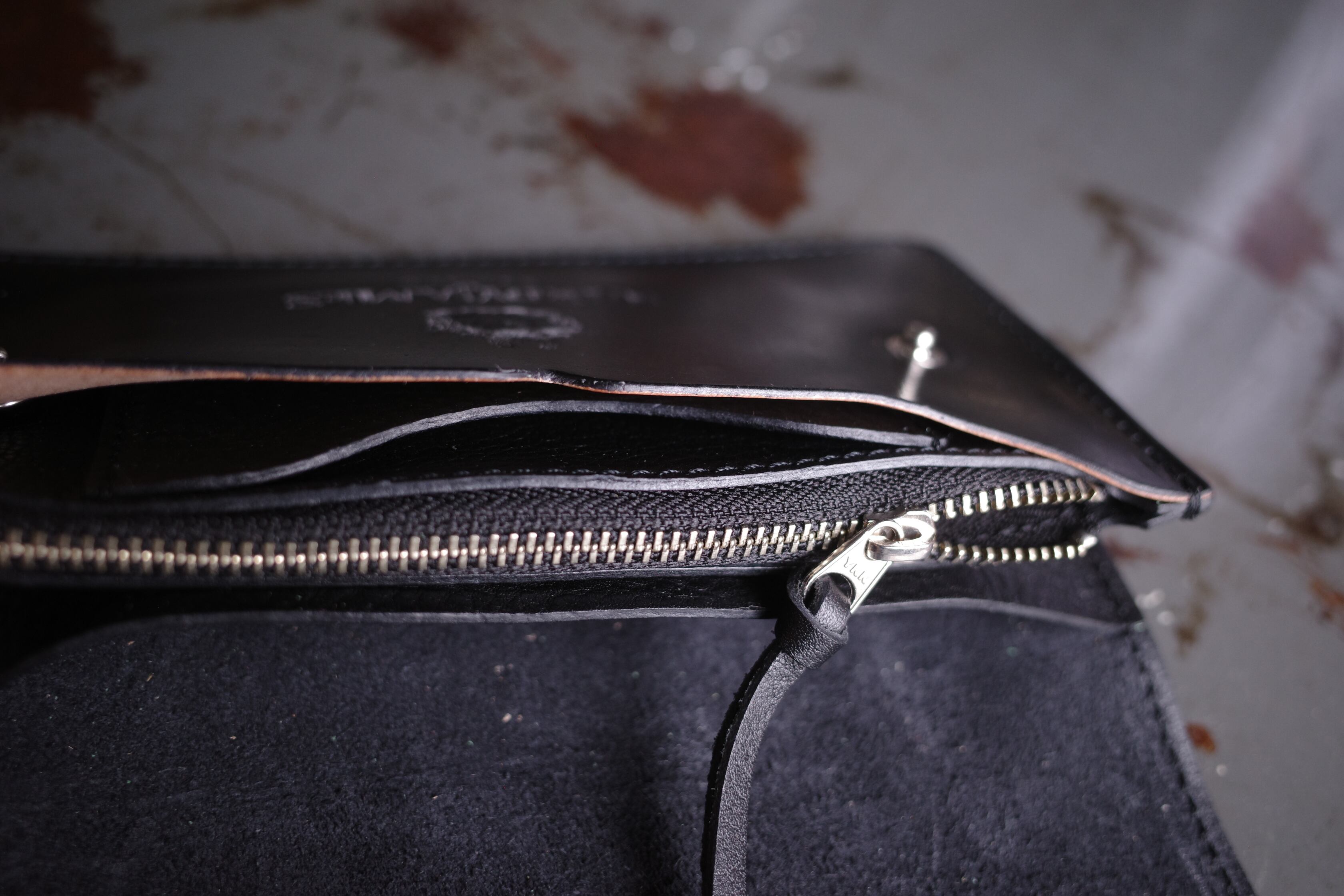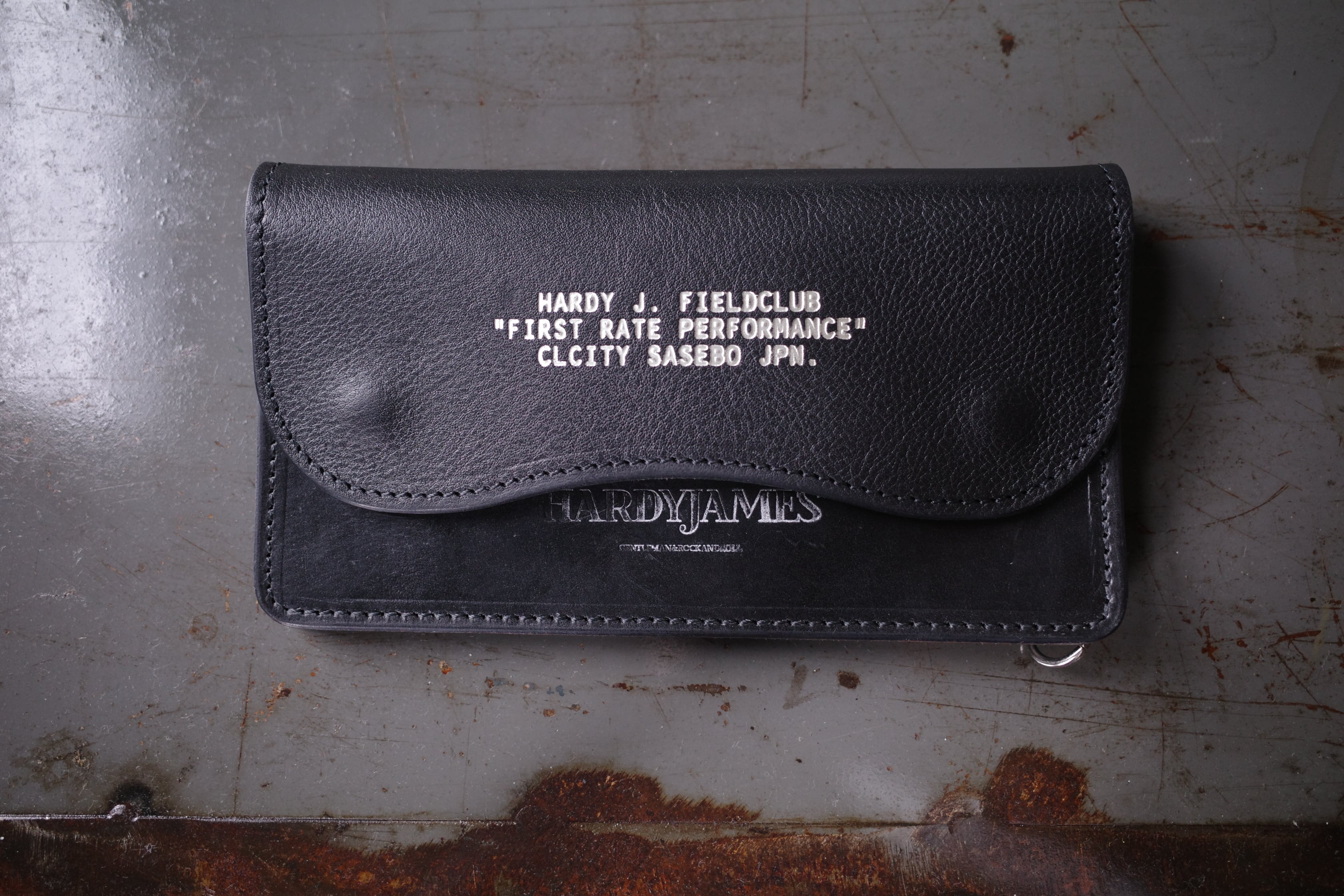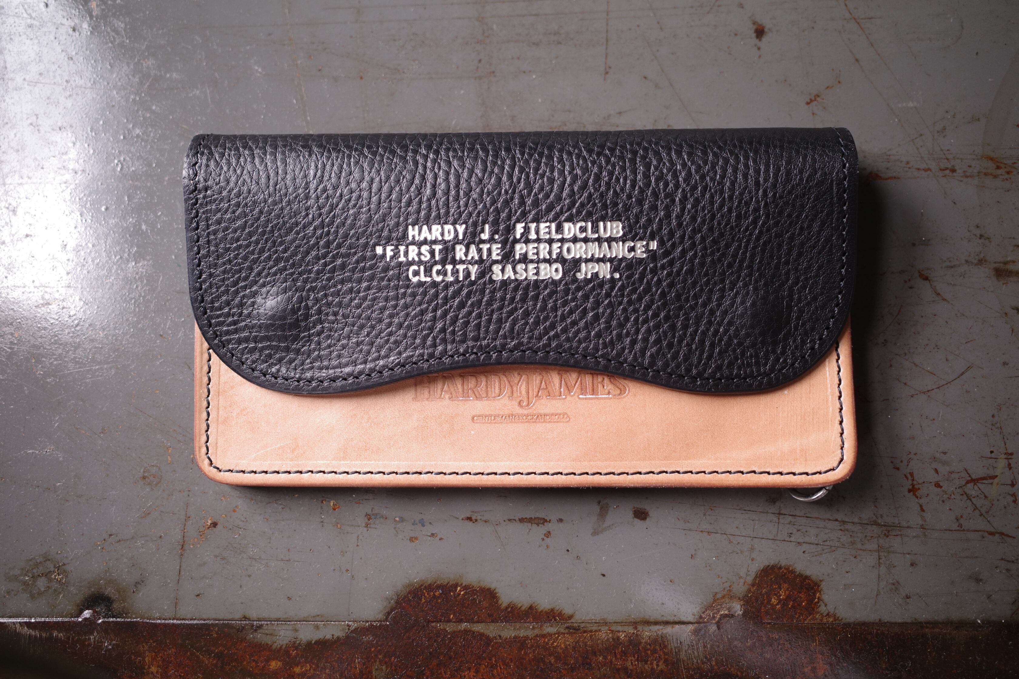 デザインはフラップをカーブでカッティング、サドルレザーとシボ入りのレザーのコンビにすることでポケットへ収めた際に洗練された印象を与えます。