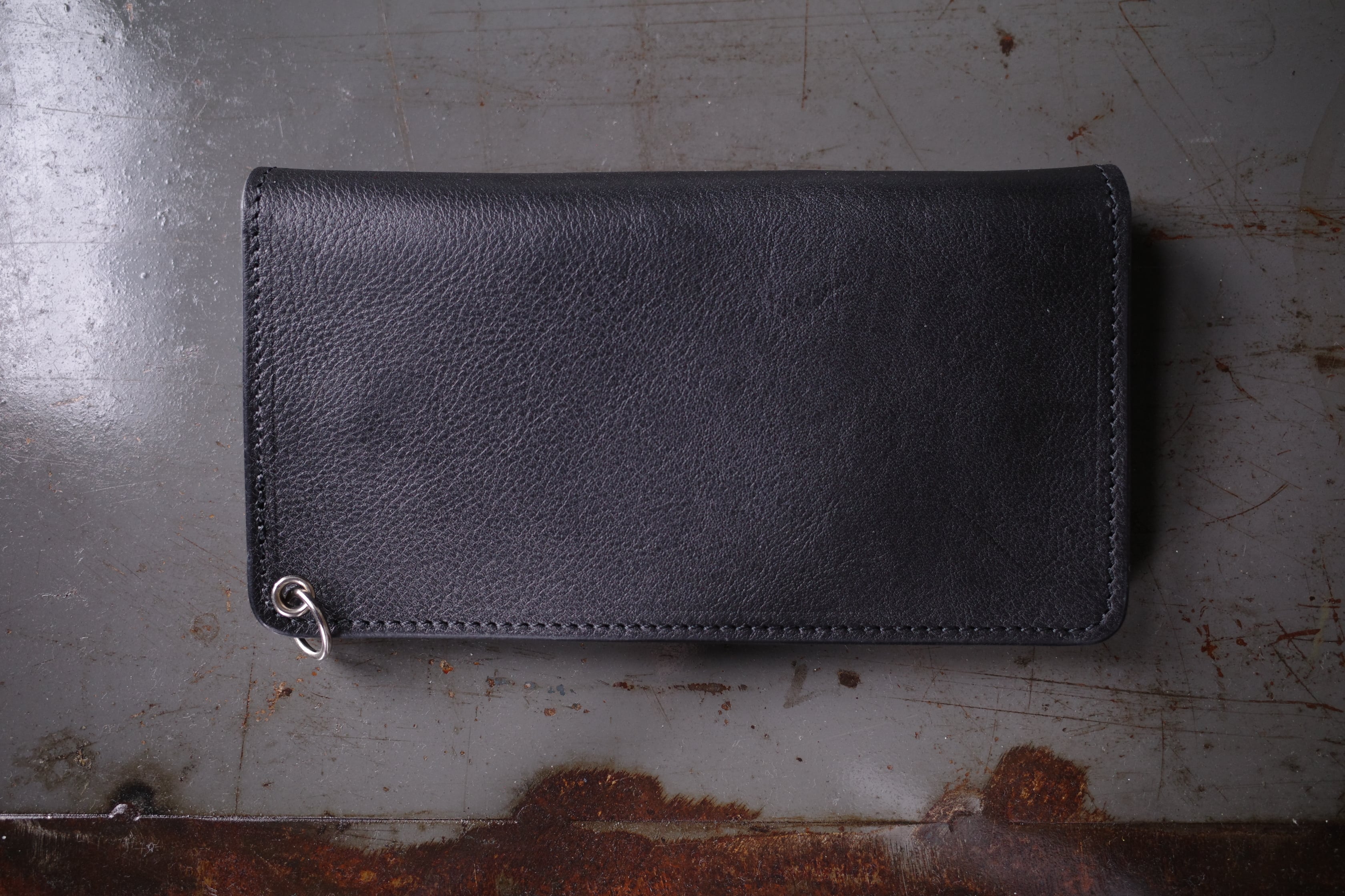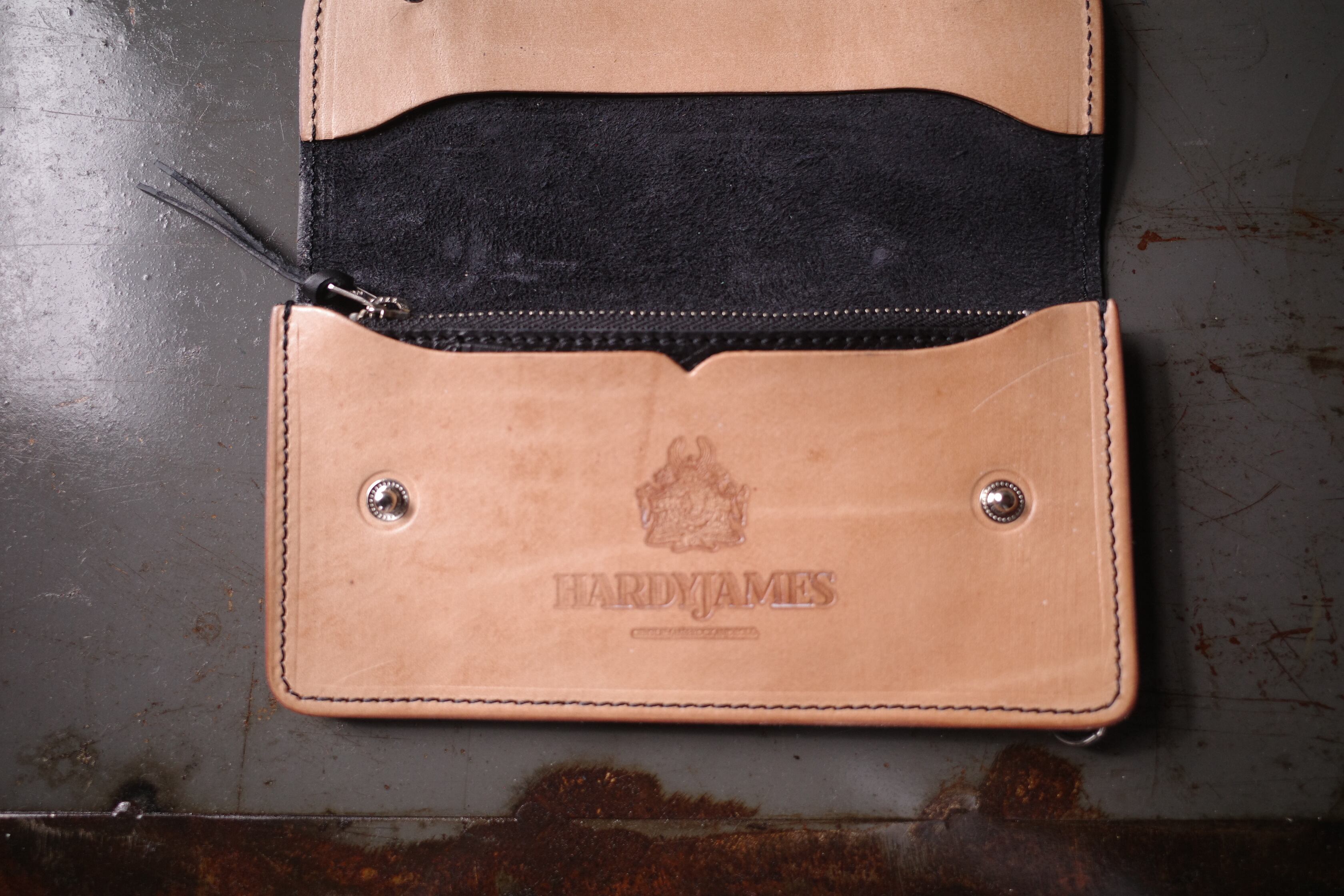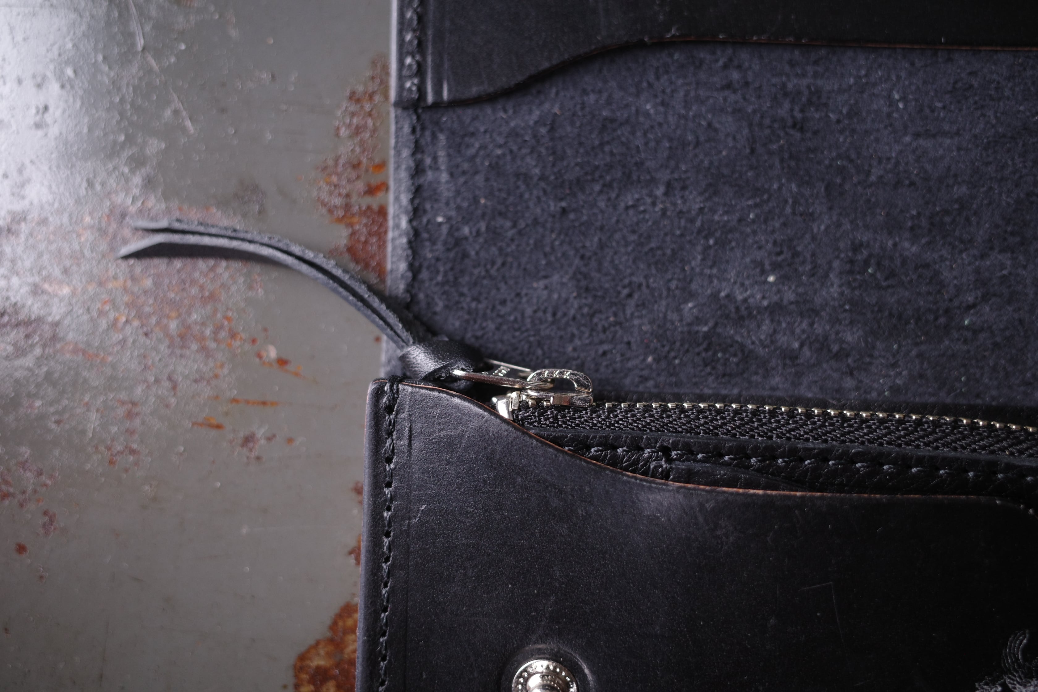 デザインはフラップをカーブでカッティング、サドルレザーとシボ入りのレザーのコンビにすることでポケットへ収めた際に洗練された印象を与えます。